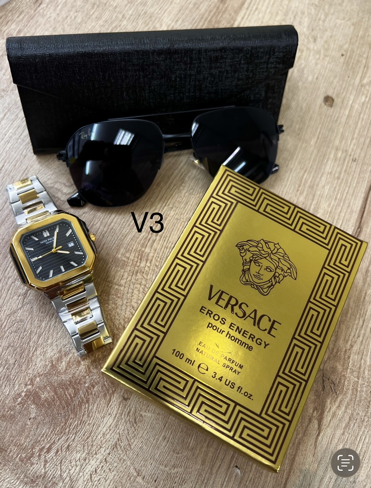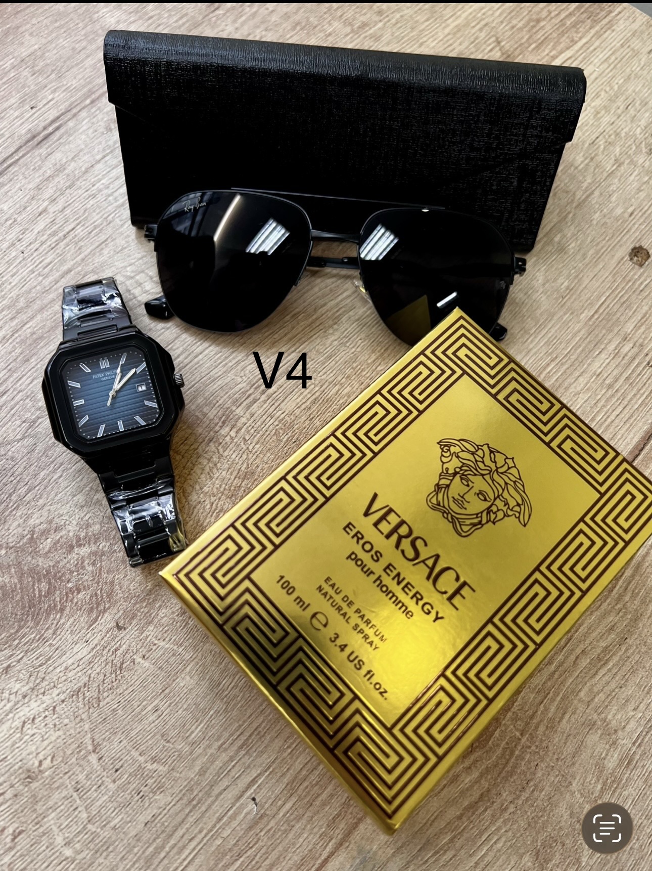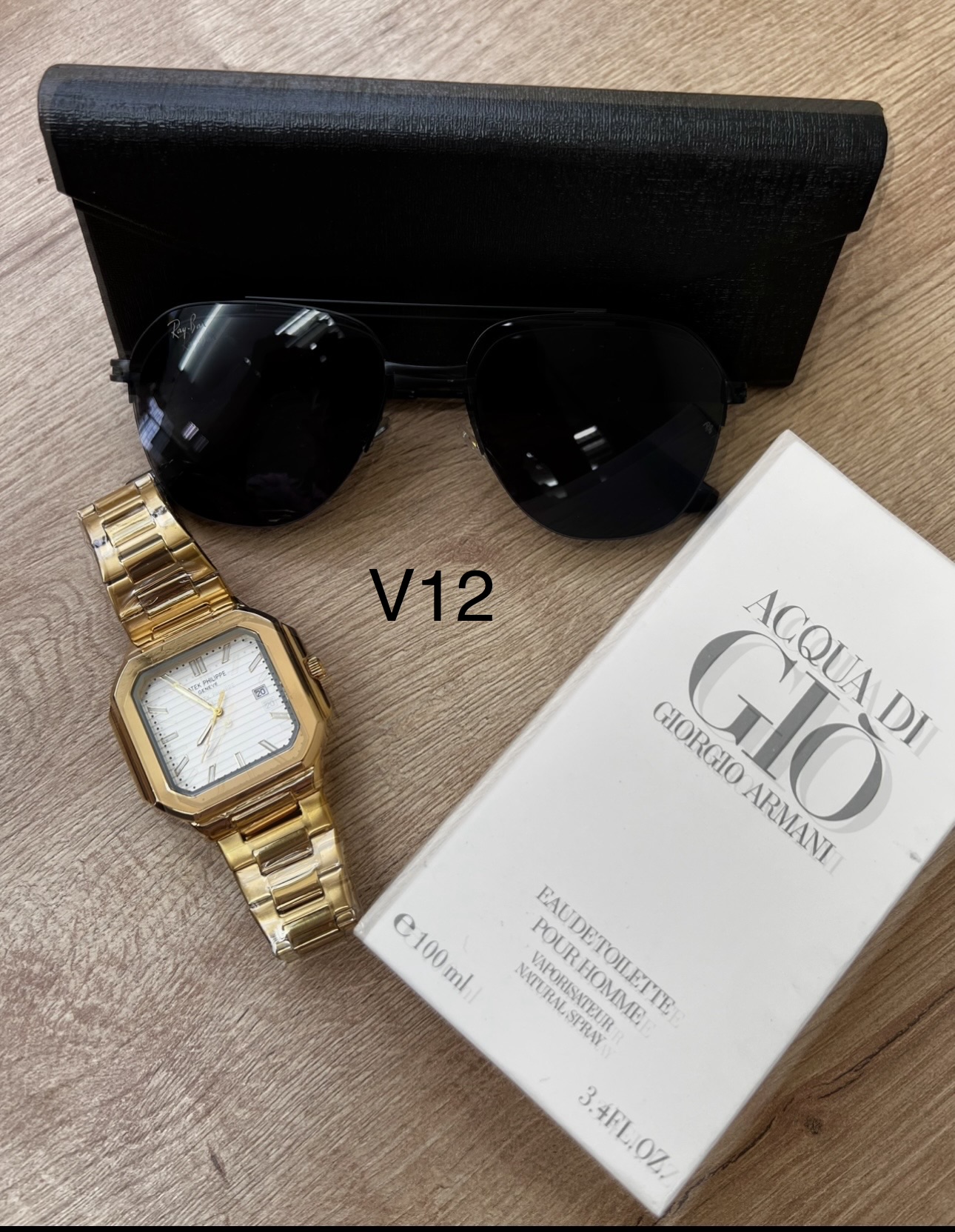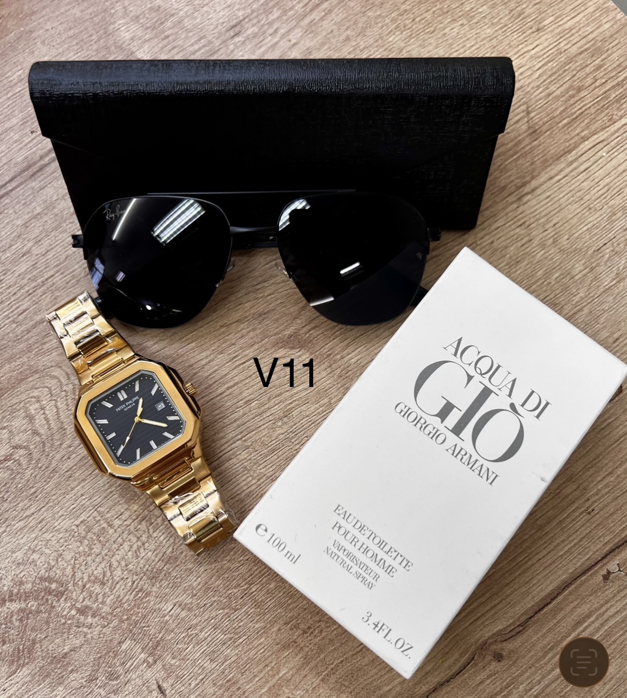 Descripción ⌚ Reloj Fili Triple A (A Pila) Diseño cuadrado moderno con acabado premium.Movimiento a pila preciso y confiable.Brazalete metálico brillante y resistente.Esfera detallada con marcadores elegantes.Ideal para uso diario o para complementar un outfit de impacto. 🕶️ Gafas con Protección Solar UVLentes con filtro UV400 para proteger tus ojos del sol.Modelo moderno tipo boutique.Incluye estuche rígido elegante.Perfectas para manejar, salir o dar un look más imponente. 👑 Perfume Triple A – Duración 6 HorasFragancia masculina intensa y seductora.Presentación elegante de 100 ml.Duración aproximada: 6 horas en piel.Opción ideal para uso diario, oficina o citas.🎁 Incluye todo esto:Reloj Fili Triple A ✔️Gafas con protección solar ✔️Perfume Triple A de larga duración ✔️Estuche de gafas ✔️💥 Un combo con estilo, calidad y presencia… perfecto para regalar o para elevar tu imagen.